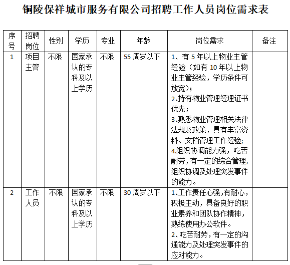 因業(yè)務發(fā)展需要,銅陵保祥城市服務有限公司面向社會公開招聘工作人員2名。具體事項公告如下: